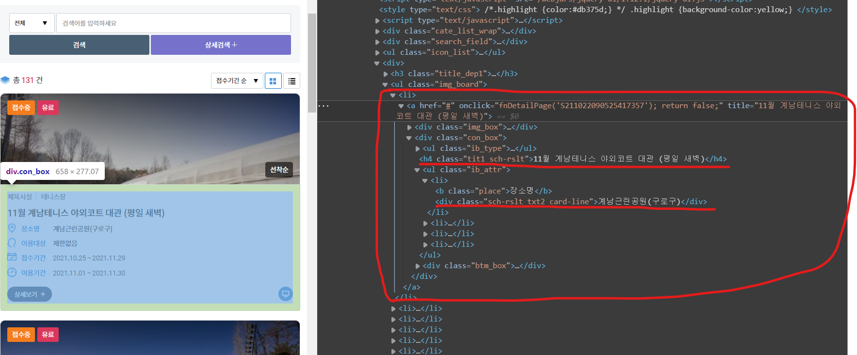 <li> 자식 태그 중에 <h4 class="tit1 sch-rslt">이 게시글의 제목이고 <div class="sch-rslt txt2 card-line">가 테니스장의 장소입니다.