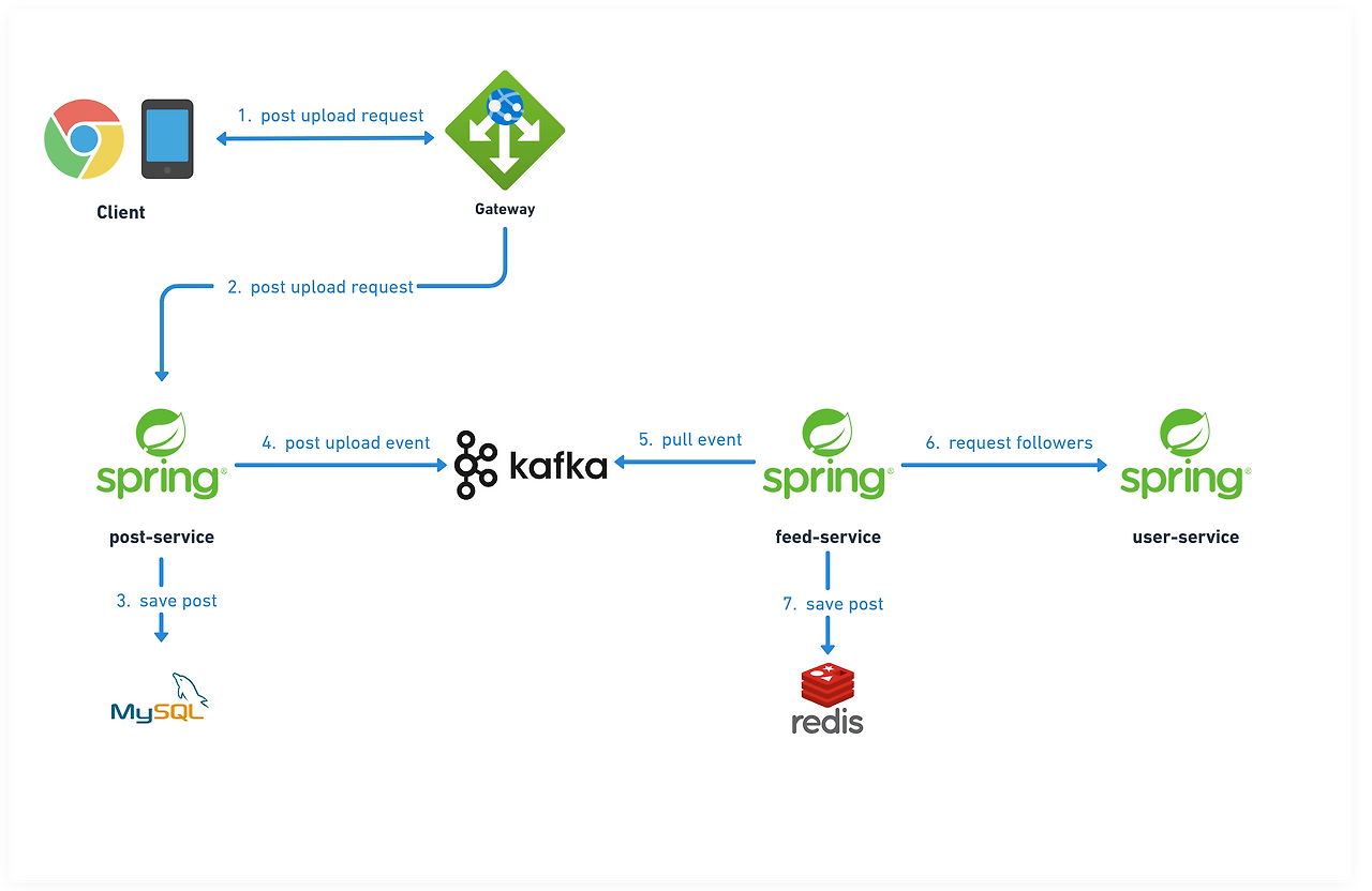 - post-service는 게시글을 DB에 저장한 뒤, 게시글 업로드 이벤트를 Kafka로 발행한다.
